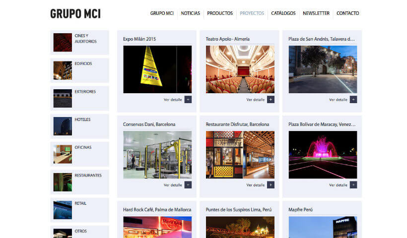 El grupo MCI necesitaba una página web corporativa en la que se pudiesen mostrar y separar visualmente las diferentes marcas del grupo así como su catálogo de productos. Esta página es visitada frecuentemente por muchos arquitectos, decoradores y empresas que requieren productos de iluminación e instalaciones para sus proyectos, por este motivo, uno de los puntos importantes era poder relacionar el producto con el proyecto, de tal forma que cliente pueda ver el efecto y tipo de iluminación de cada producto en casos reales.